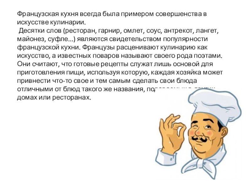 слов (ресторан, гарнир, омлет, соус, антрекот, лангет, майонез, суфле...) являются свидетельством популярности французской кухни. Французы расценивают кулинарию как искусство, а известных поваров называют своего рода поэтами. Они считают, что готовые рецепты служат лишь основой для приготовления пищи, используя которую, каждая хозяйка может привнести что-то свое и тем самым сделать свои блюда отличными от блюд такого же названия, подаваемых в других домах или ресторанах.