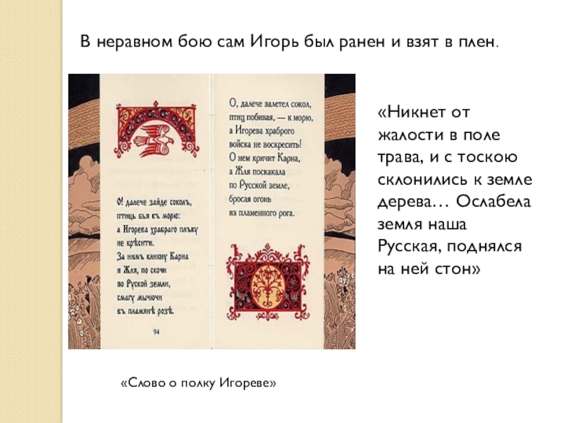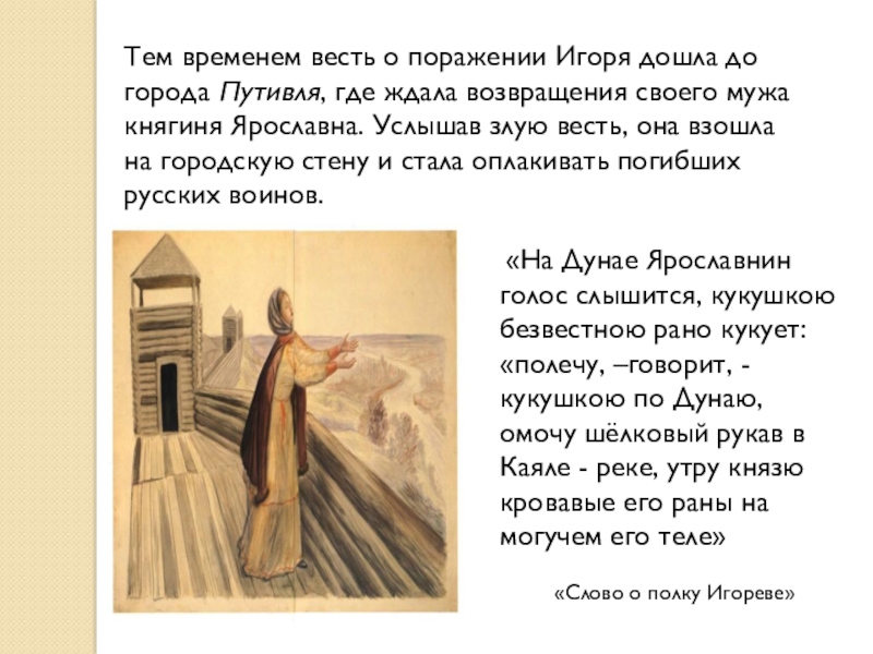 «На Дунае Ярославнин голос слышится, кукушкою безвестною рано кукует: «полечу, –говорит, - кукушкою по Дунаю, омочу шёлковый рукав в Каяле - реке, утру князю кровавые его раны на могучем его теле»