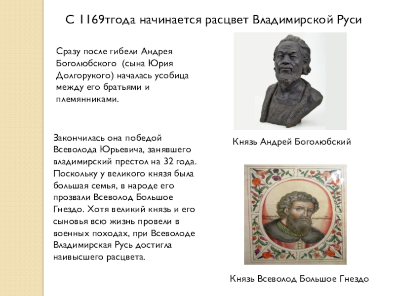 Закончилась она победой Всеволода Юрьевича, занявшего владимирский престол на 32 года. Поскольку у великого князя была большая семья, в народе его прозвали Всеволод Большое Гнездо. Хотя великий князь и его сыновья всю жизнь провели в военных походах, при Всеволоде Владимирская Русь достигла наивысшего расцвета.