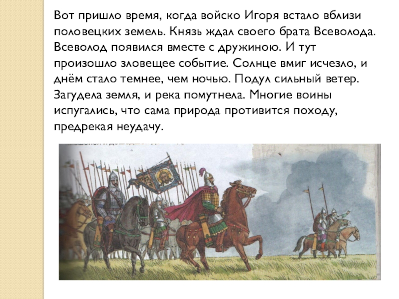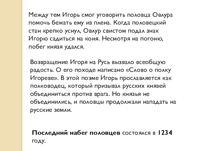 Возвращение Игоря на Русь вызвало всеобщую радость. О его походе написано «Слово о полку Игореве». В этой поэме Игорь прославляется как полководец, который призывал русских князей объединиться против врага. Но князья не объединились, и половцы продолжали нападать на русские земли.