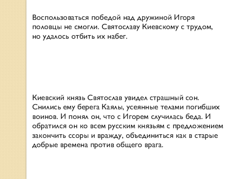 Воспользоваться победой над дружиной Игоря половцы не смогли. Святославу Киевскому с трудом, но удалось отбить их набег.