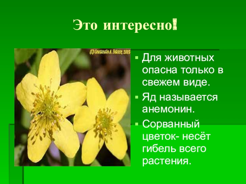 Это интересно!Для животных опасна только в свежем виде.Яд называется анемонин.Сорванный цветок- несёт гибель всего растения.