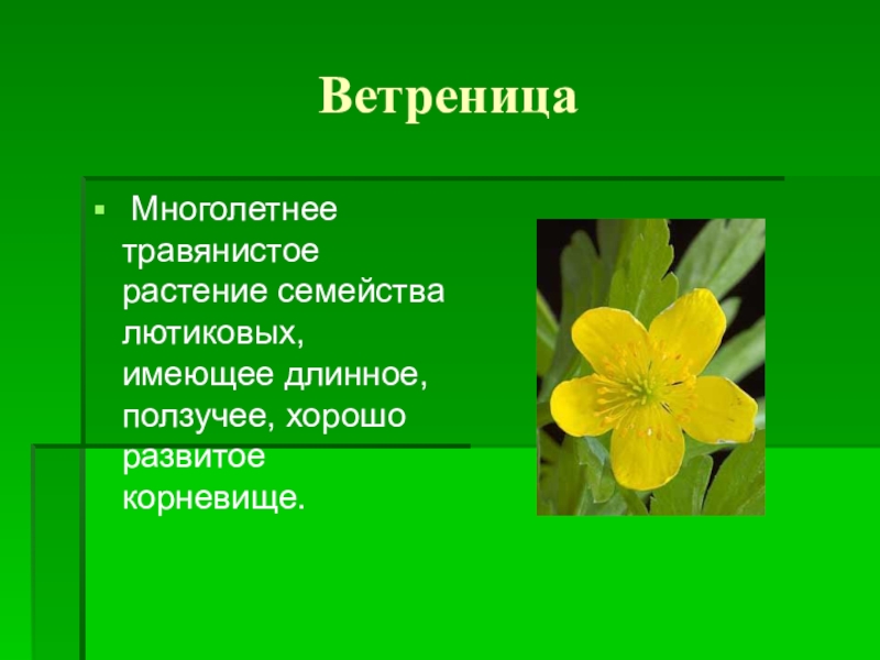Ветреница Многолетнее травянистое растение семейства лютиковых, имеющее длинное, ползучее, хорошо развитое корневище.