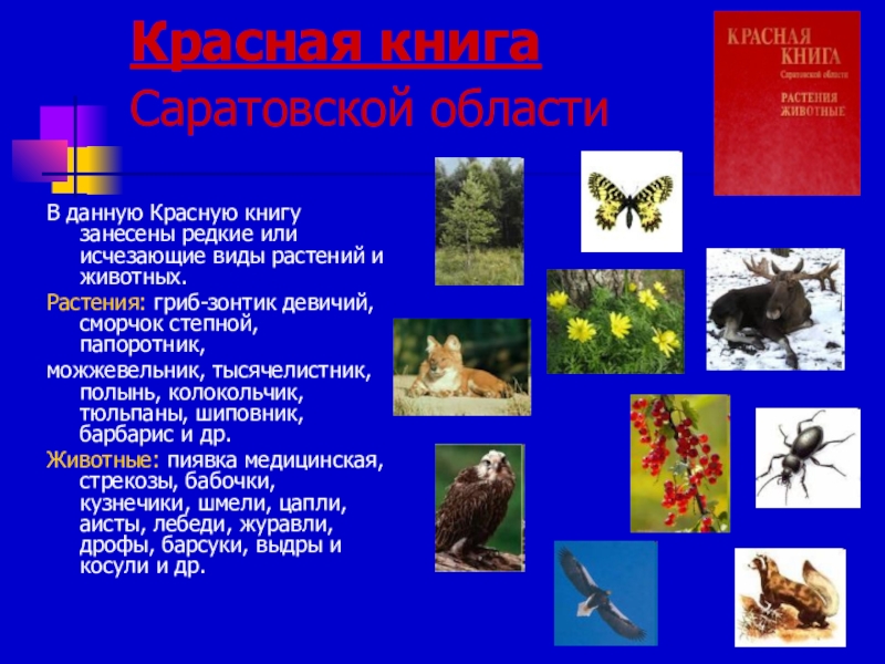 Животные: пиявка медицинская, стрекозы, бабочки, кузнечики, шмели, цапли, аисты, лебеди, журавли, дрофы, барсуки, выдры и косули и др.