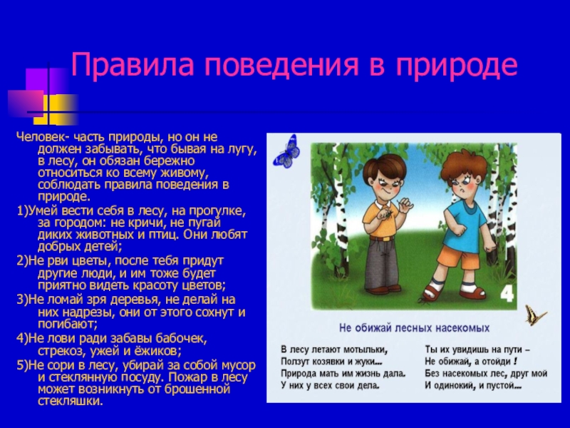 4)Не лови ради забавы бабочек, стрекоз, ужей и ёжиков;