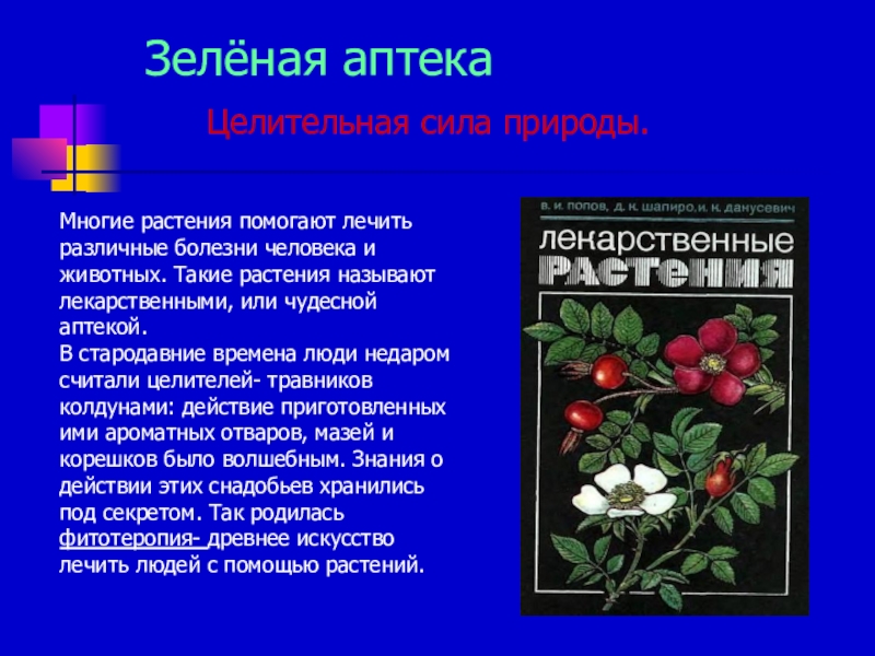 лечить различные болезни человека и животных. Такие растения называют лекарственными, или чудесной аптекой.
