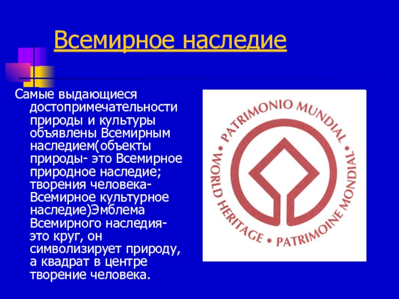 это Всемирное природное наследие; творения человека- Всемирное культурное наследие)Эмблема Всемирного наследия- это круг, он символизирует природу, а квадрат в центре творение человека.