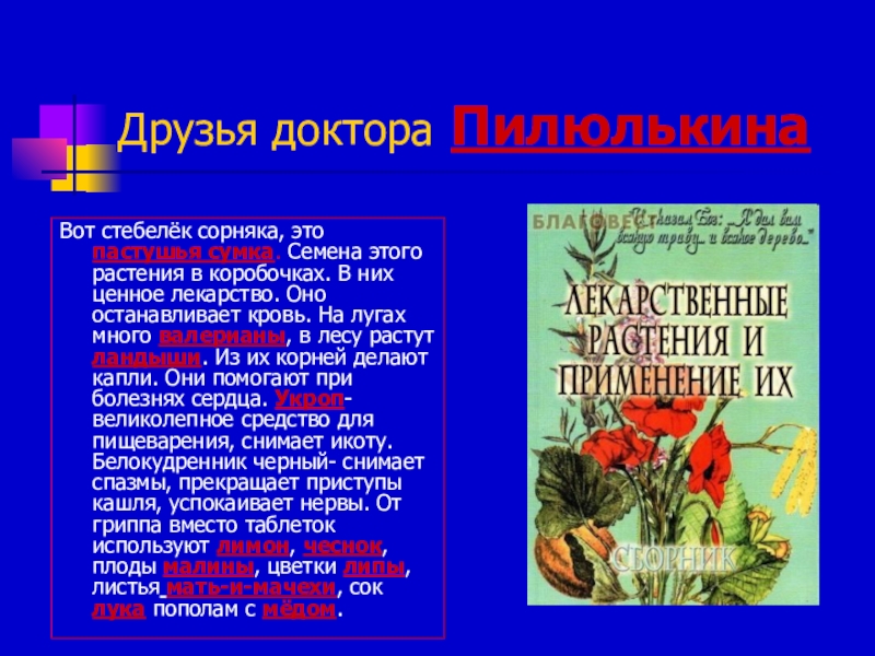 в коробочках. В них ценное лекарство. Оно останавливает кровь. На лугах много валерианы, в лесу растут ландыши. Из их корней делают капли. Они помогают при болезнях сердца. Укроп- великолепное средство для пищеварения, снимает икоту. Белокудренник черный- снимает спазмы, прекращает приступы кашля, успокаивает нервы. От гриппа вместо таблеток используют лимон, чеснок, плоды малины, цветки липы, листья мать-и-мачехи, сок лука пополам с мёдом.