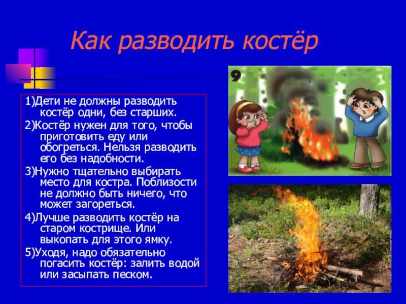 5)Уходя, надо обязательно погасить костёр: залить водой или засыпать песком.