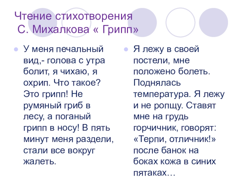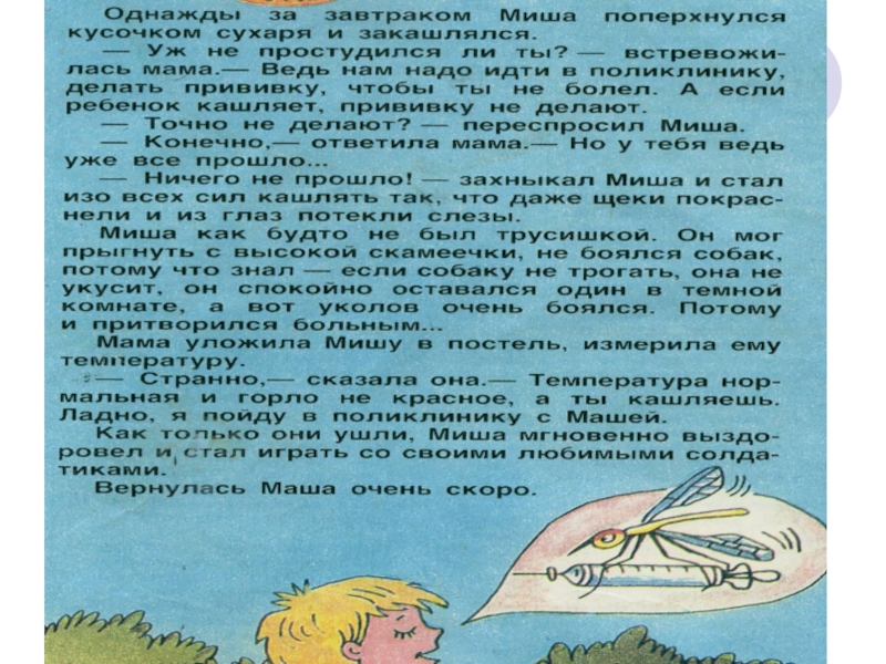 Я лежу в своей постели, мне положено болеть. Поднялась температура. Я лежу и не ропщу. Ставят мне на грудь горчичник, говорят: «Терпи, отличник!» после банок на боках кожа в синих пятаках…