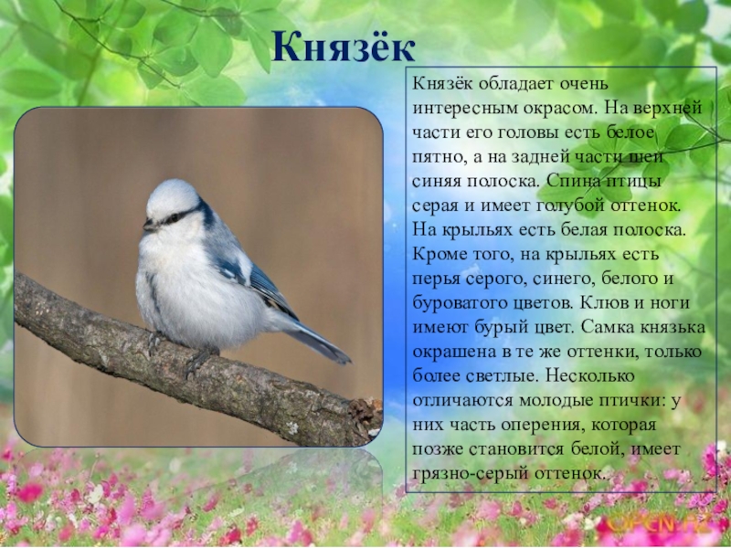 есть белое пятно, а на задней части шеи синяя полоска. Спина птицы серая и имеет голубой оттенок. На крыльях есть белая полоска. Кроме того, на крыльях есть перья серого, синего, белого и буроватого цветов. Клюв и ноги имеют бурый цвет. Самка князька окрашена в те же оттенки, только более светлые. Несколько отличаются молодые птички: у них часть оперения, которая позже становится белой, имеет грязно-серый оттенок.