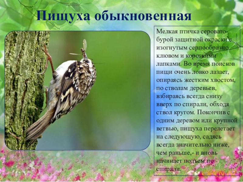 короткими лапками. Во время поисков пищи очень ловко лазает, опираясь жестким хвостом, по стволам деревьев, взбираясь всегда снизу вверх по спирали, обходя ствол кругом. Покончив с одним деревом или крупной ветвью, пищуха перелетает на следующую, садясь всегда значительно ниже, чем раньше,- и вновь начинает подъем по спирали.