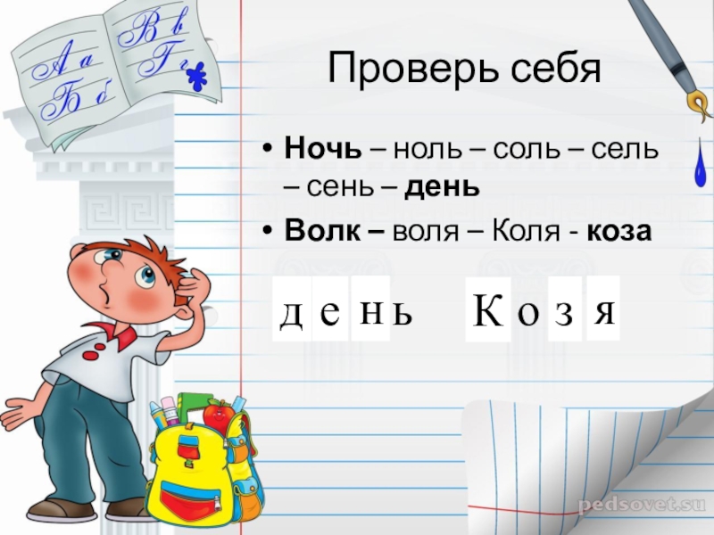 Ночь – ноль-соль-соло-село-сено-сень-день