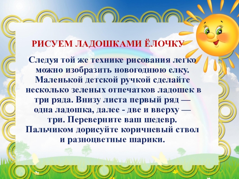 елку. Маленькой детской ручкой сделайте несколько зеленых отпечатков ладошек в три ряда. Внизу листа первый ряд — одна ладошка, далее - две и вверху — три. Переверните ваш шедевр. Пальчиком дорисуйте коричневый ствол и разноцветные шарики.
