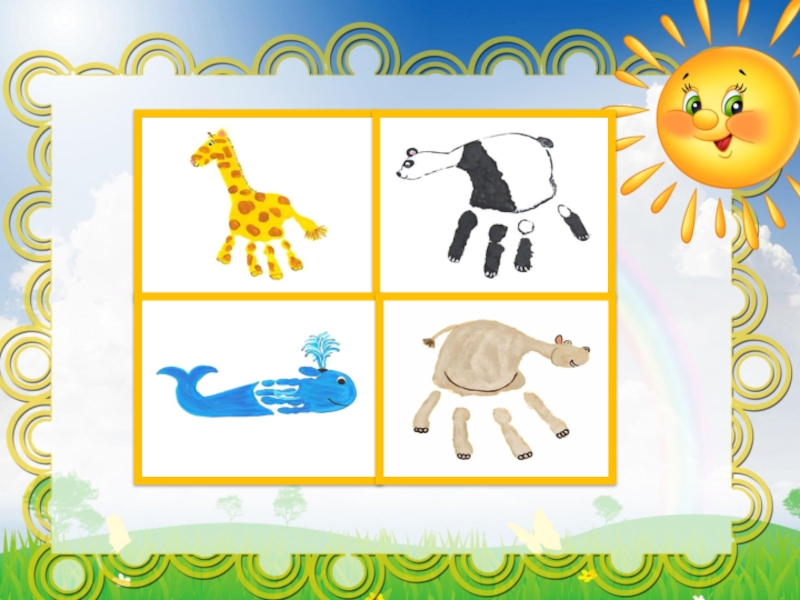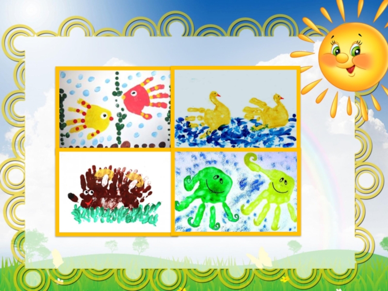Рисуя ладошками и пальцами ребенок может изобразить вполне узнаваемые незамысловатые предметы. Это могут быть различные животные — например жираф, осьминог или верблюд, кроме того, из отпечатков рук может получиться солнышко, цветок или елка.