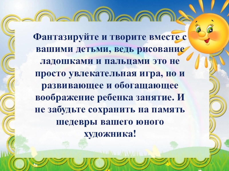 Слайд 12Фантазируйте и творите вместе с вашими детьми, ведь рисование ладошками и