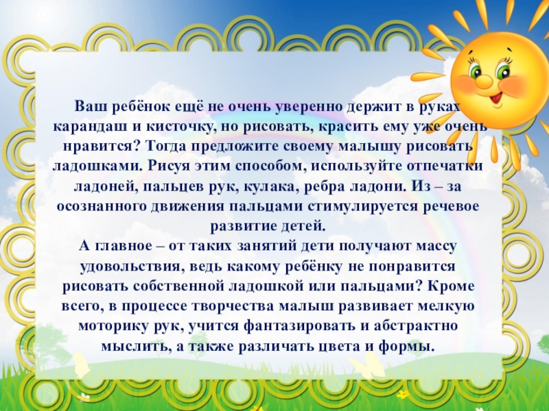 кисточку, но рисовать, красить ему уже очень нравится? Тогда предложите своему малышу рисовать ладошками. Рисуя этим способом, используйте отпечатки ладоней, пальцев рук, кулака, ребра ладони. Из – за осознанного движения пальцами стимулируется речевое развитие детей. А главное – от таких занятий дети получают массу удовольствия, ведь какому ребёнку не понравится рисовать собственной ладошкой или пальцами? Кроме всего, в процессе творчества малыш развивает мелкую моторику рук, учится фантазировать и абстрактно мыслить, а также различать цвета и формы.