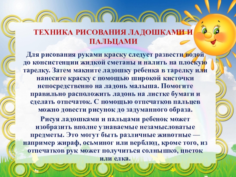 ТЕХНИКА РИСОВАНИЯ ЛАДОШКАМИ И ПАЛЬЦАМИДля рисования руками краску следует развести водой до консистенции жидкой сметаны и налить