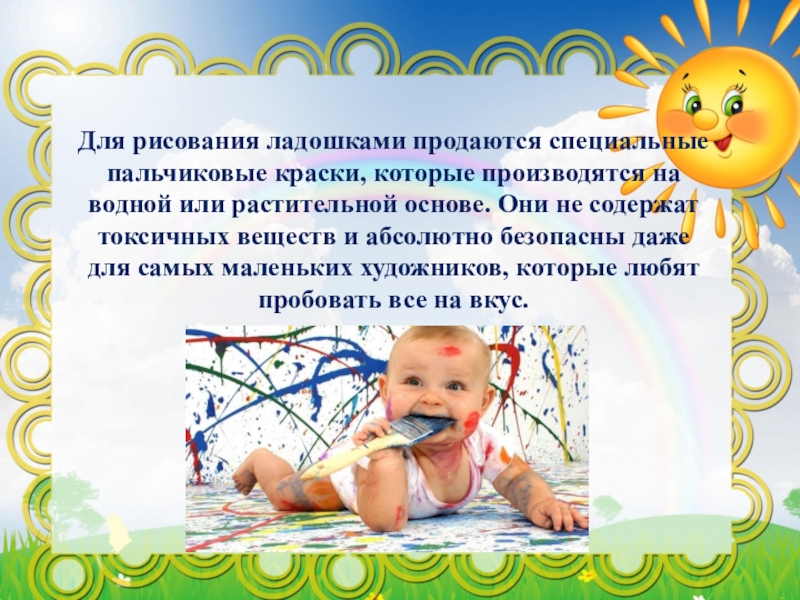 Слайд 3Для рисования ладошками продаются специальные пальчиковые краски, которые производятся на водной