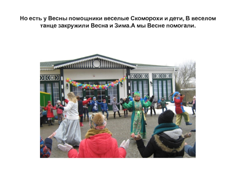 Но есть у Весны помощники веселые Скоморохи и дети, В веселом танце закружили Весна и Зима.А мы