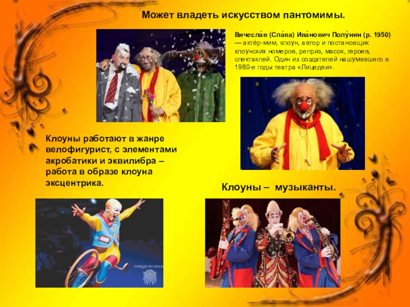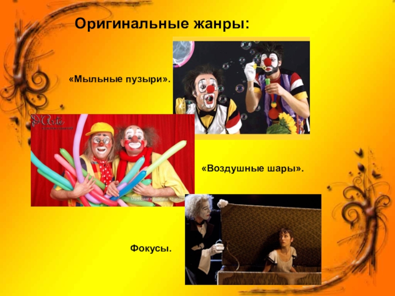 Клоуны работают в жанре велофигурист, с элементами акробатики и эквилибра – работа в образе клоуна эксцентрика.