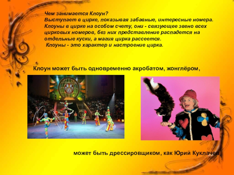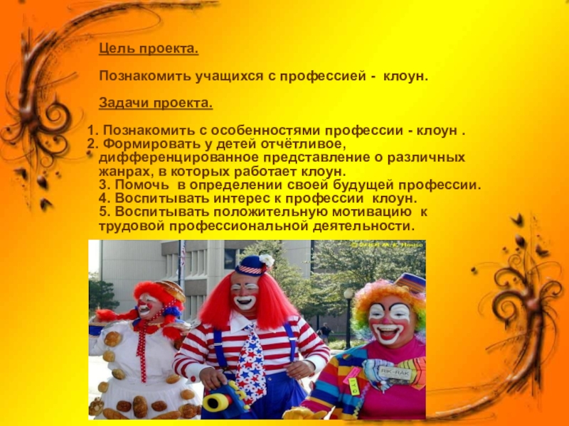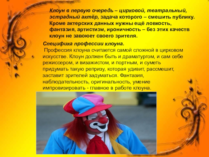 Профессия клоуна считается самой сложной в цирковом искусстве. Клоун должен быть и драматургом, и сам себе режиссером, и визажистом, и портным, и суметь придумать такую репризу, которая удивит, рассмешит, заставит зрителей задуматься. Фантазия, наблюдательность, оригинальность, умение импровизировать - главное в работе клоуна.