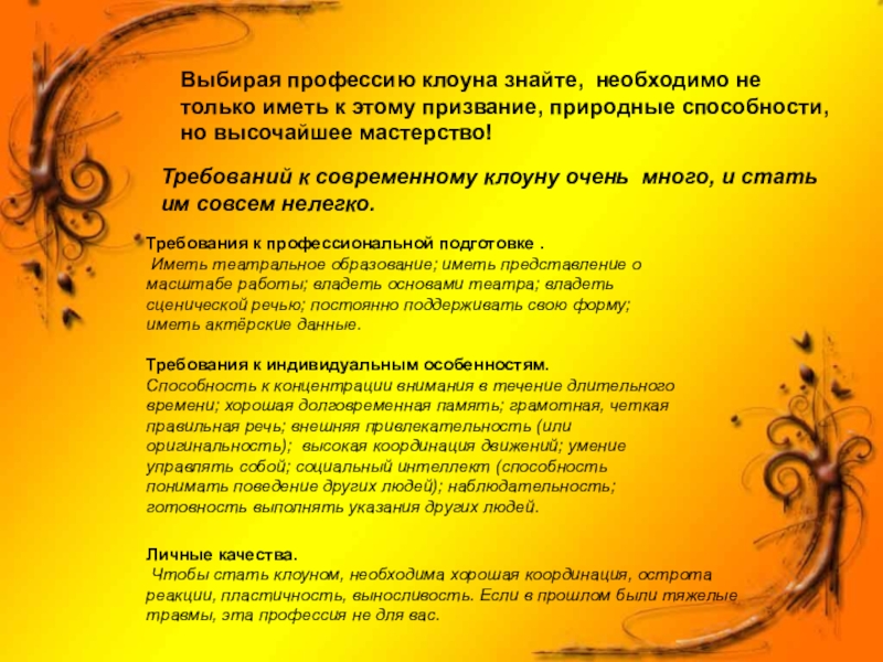Чтобы стать клоуном, необходима хорошая координация, острота реакции, пластичность, выносливость. Если в прошлом были тяжелые травмы, эта профессия не для вас.