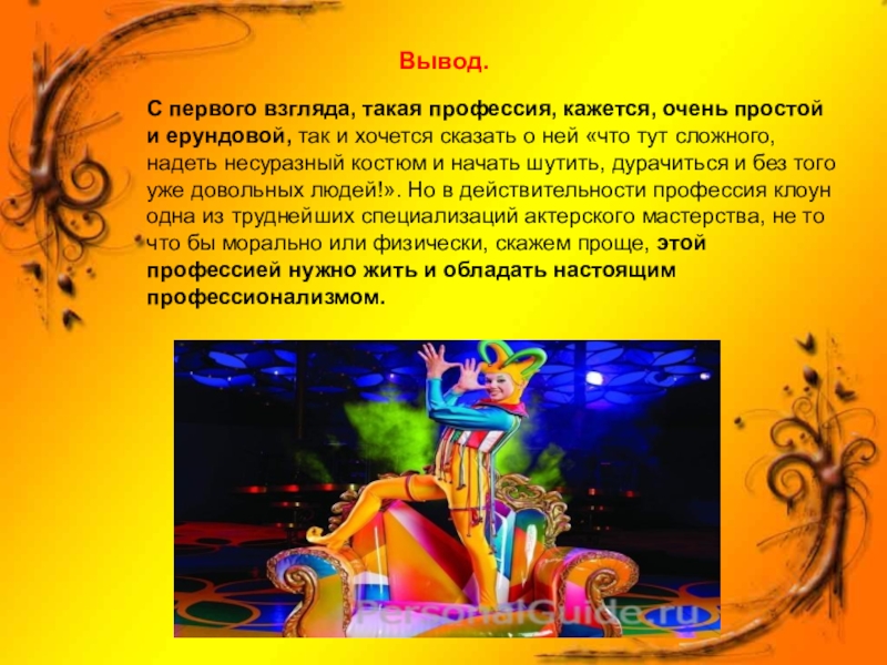 С первого взгляда, такая профессия, кажется, очень простой и ерундовой, так и хочется сказать о ней «что тут сложного, надеть несуразный костюм и начать шутить, дурачиться и без того уже довольных людей!». Но в действительности профессия клоун одна из труднейших специализаций актерского мастерства, не то что бы морально или физически, скажем проще, этой профессией нужно жить и обладать настоящим профессионализмом.