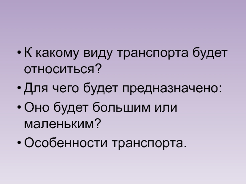 К какому виду транспорта будет относиться? Для чего будет предназначено: Оно будет большим или маленьким?Особенности транспорта.