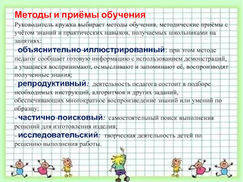 Руководитель кружка выбирает методы обучения, методические приёмы с