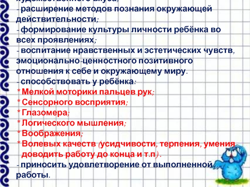 Задачи: - развитие воображения, фантазии, художественного вкуса;