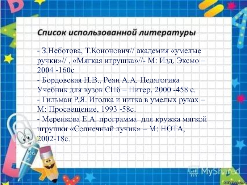 Слайд 25- З.Неботова, Т.Кононович// академия «умелые ручки»// , «Мягкая игрушка»//- М: Изд.
