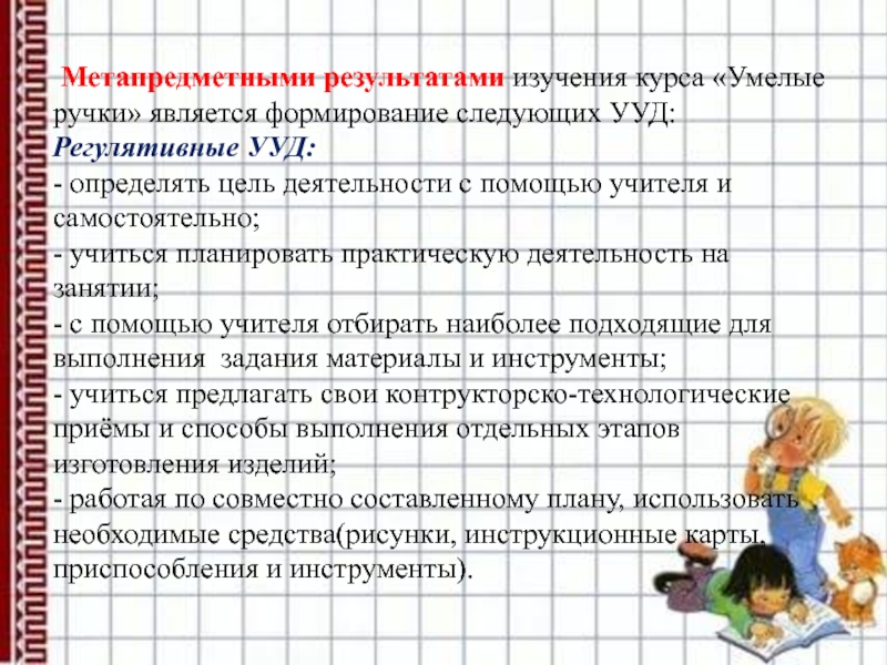 Слайд 8 Метапредметными результатами изучения курса «Умелые ручки» является формирование следующих УУД: