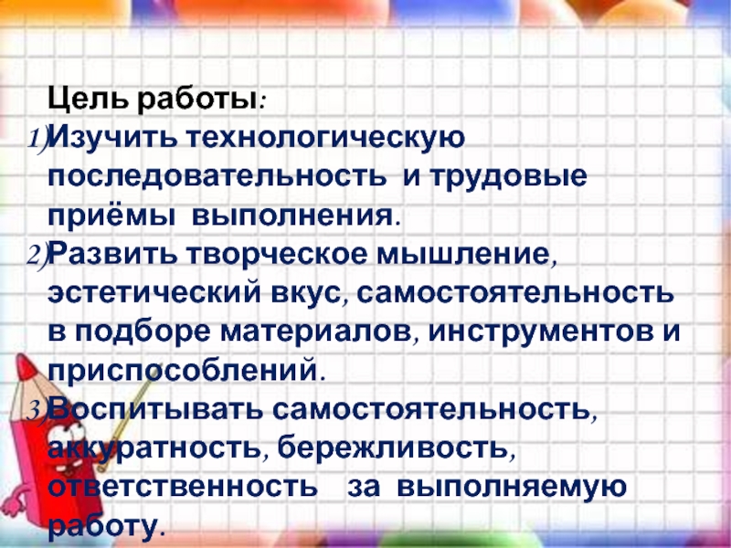 Воспитывать самостоятельность, аккуратность, бережливость, ответственность за выполняемую работу.