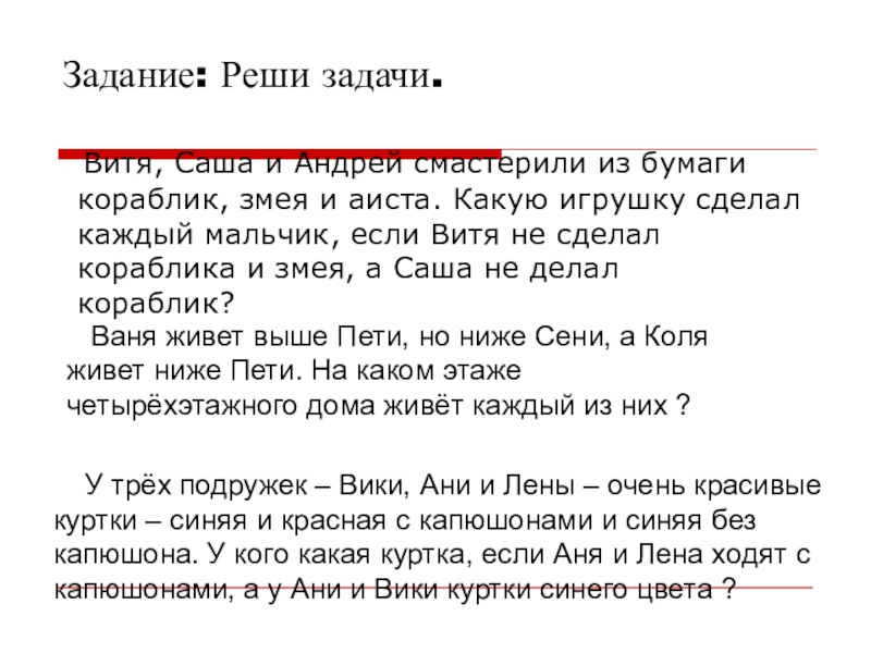 У трёх подружек – Вики, Ани и Лены – очень красивые куртки – синяя и красная с капюшонами и синяя без капюшона. У кого какая куртка, если Аня и Лена ходят с капюшонами, а у Ани и Вики куртки синего цвета ?