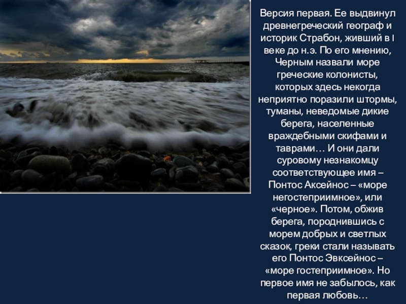 I веке до н.э. По его мнению, Черным назвали море греческие колонисты, которых здесь некогда неприятно поразили штормы, туманы, неведомые дикие берега, населенные враждебными скифами и таврами… И они дали суровому незнакомцу соответствующее имя – Понтос Аксейнос – «море негостеприимное», или «черное». Потом, обжив берега, породнившись с морем добрых и светлых сказок, греки стали называть его Понтос Эвксейнос – «море гостеприимное». Но первое имя не забылось, как первая любовь…