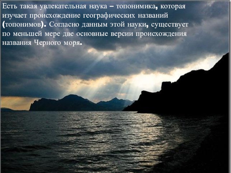 (топонимов). Согласно данным этой науки, существует по меньшей мере две основные версии происхождения названия Черного моря.