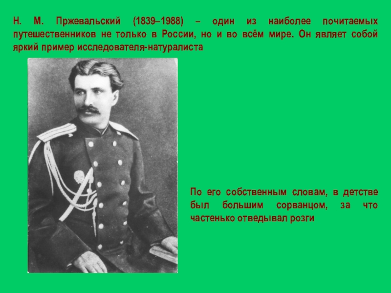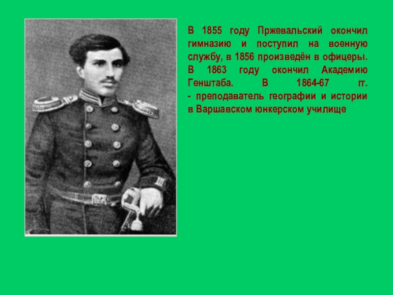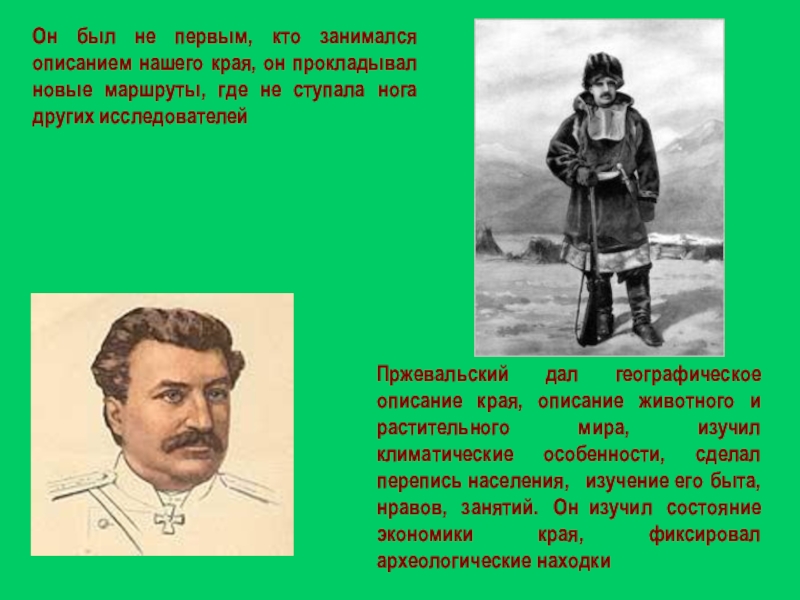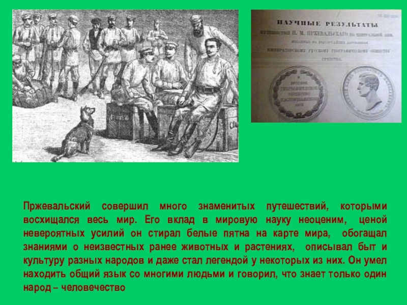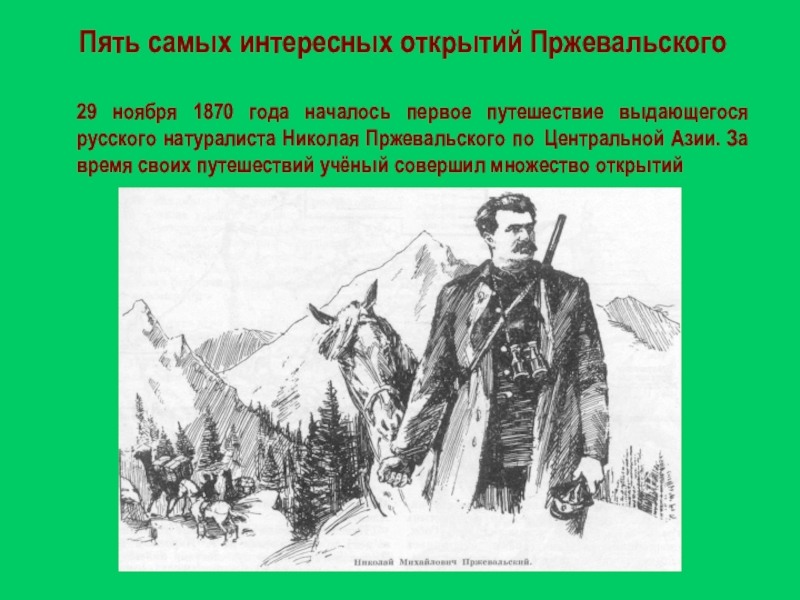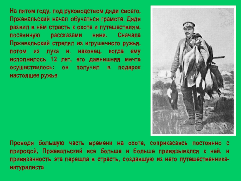 Проводя большую часть времени на охоте, соприкасаясь постоянно с природой, Пржевальский все больше и больше привязывался к ней, и привязанность эта перешла в страсть, создавшую из него путешественника-натуралиста