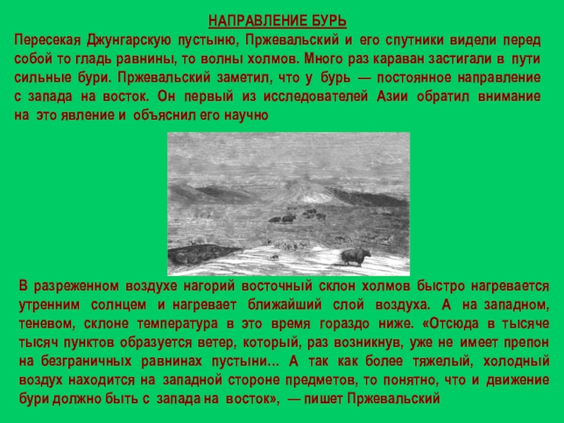 Пересекая Джунгарскую пустыню, Пржевальский и его спутники видели перед собой то гладь равнины, то волны холмов. Много раз караван застигали в пути сильные бури. Пржевальский заметил, что у бурь — постоянное направление с запада на восток. Он первый из исследователей Азии обратил внимание на это явление и объяснил его научно