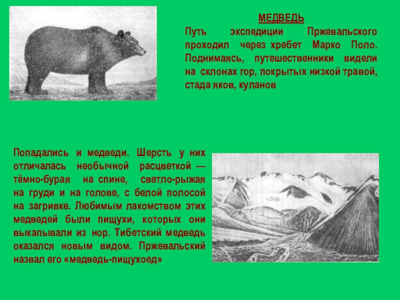 Попадались и медведи. Шерсть у них отличалась необычной расцветкой — тёмно-бурая на спине, светло-рыжая на груди и на голове, с белой полосой на загривке. Любимым лакомством этих медведей были пищухи, которых они выкапывали из нор. Тибетский медведь оказался новым видом. Пржевальский назвал его «медведь-пищухоед»