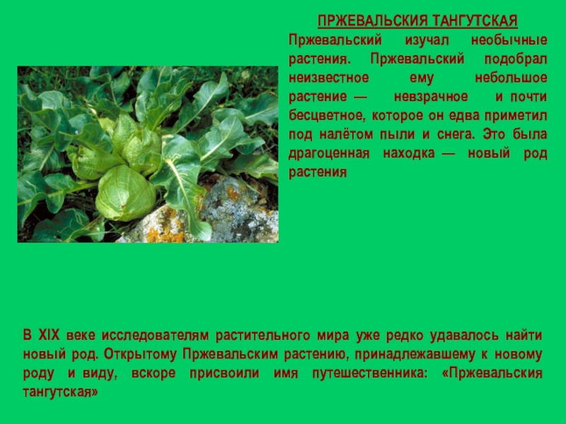 В XIX веке исследователям растительного мира уже редко удавалось найти новый род. Открытому Пржевальским растению, принадлежавшему к новому роду и виду, вскоре присвоили имя путешественника: «Пржевальския тангутская»