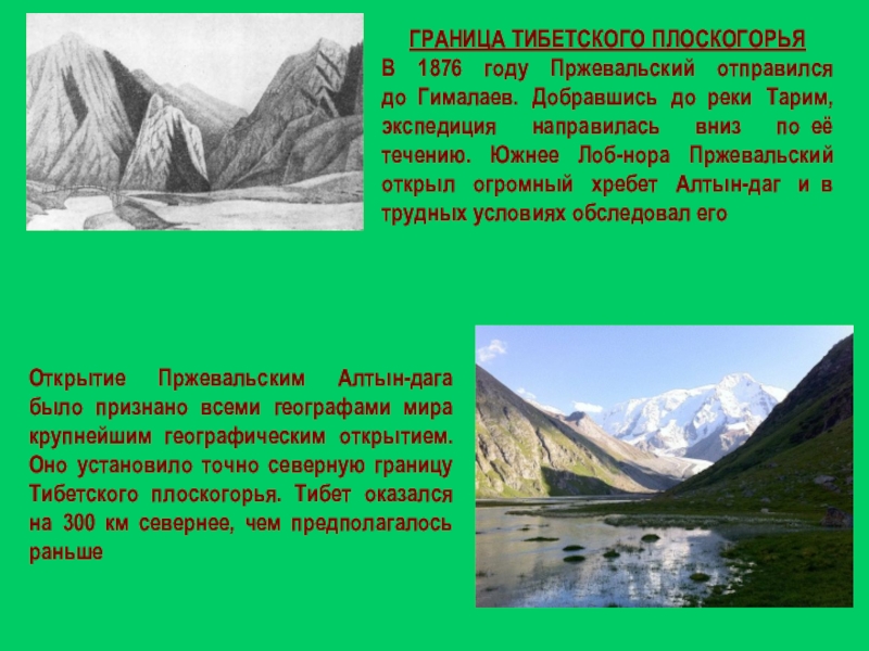 Открытие Пржевальским Алтын-дага было признано всеми географами мира крупнейшим географическим открытием. Оно установило точно северную границу Тибетского плоскогорья. Тибет оказался на 300 км севернее, чем предполагалось раньше