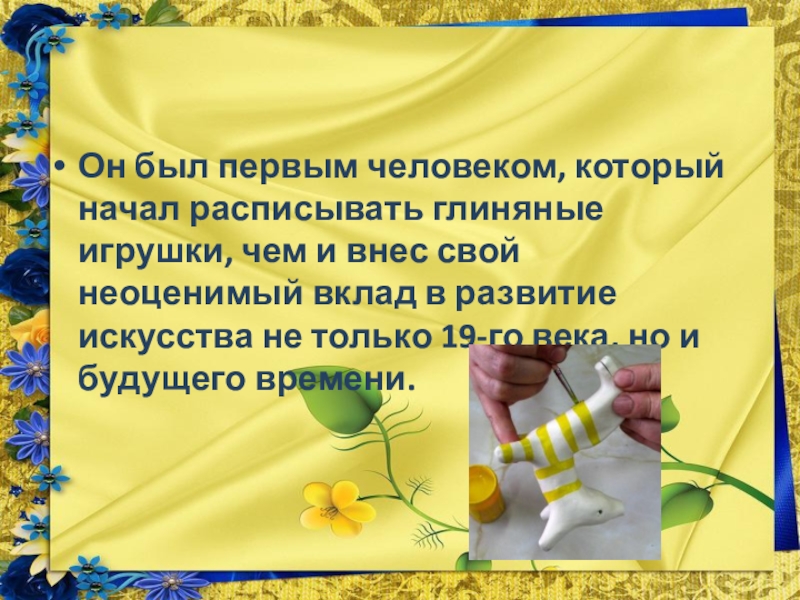 Слайд 41Он был первым человеком, который начал расписывать глиняные игрушки, чем и