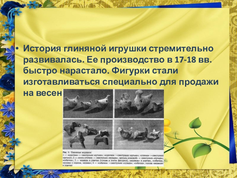 Слайд 8История глиняной игрушки стремительно развивалась. Ее производство в 17-18 вв. быстро
