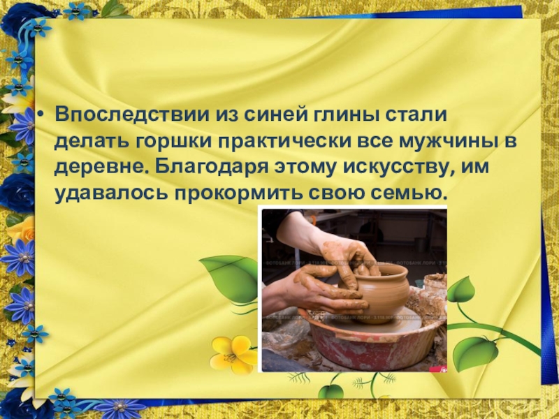 Слайд 43Впоследствии из синей глины стали делать горшки практически все мужчины в