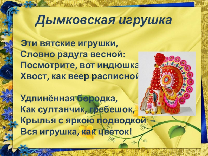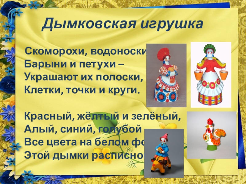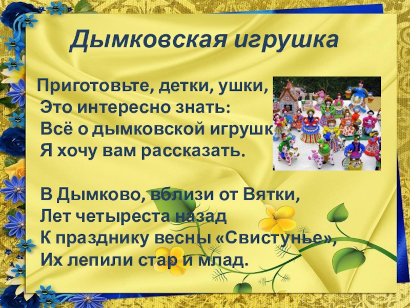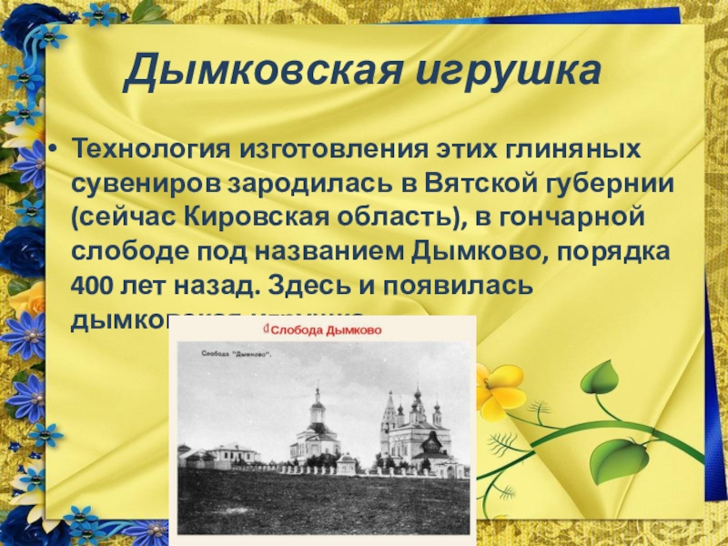 Кировская область), в гончарной слободе под названием Дымково, порядка 400 лет назад. Здесь и появилась дымковская игрушка.