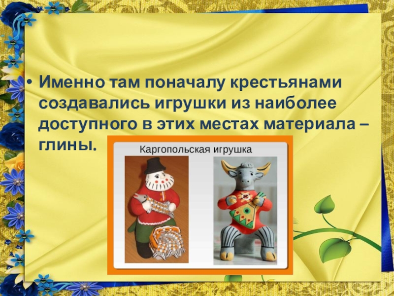 Слайд 13Именно там поначалу крестьянами создавались игрушки из наиболее доступного в этих