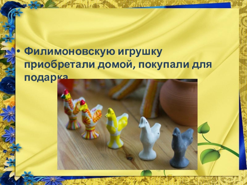 Слайд 45Филимоновскую игрушку приобретали домой, покупали для подарка.