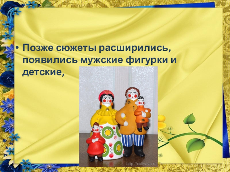 Слайд 29Позже сюжеты расширились, появились мужские фигурки и детские,
