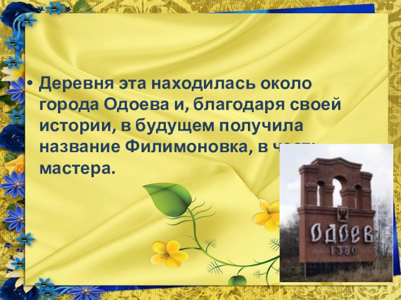 Слайд 42Деревня эта находилась около города Одоева и, благодаря своей истории, в